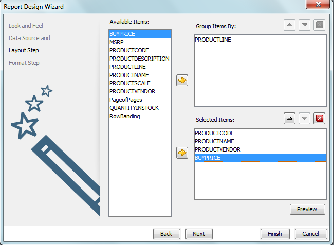 - Define your report layout, set a data grouping, specify the fields that will appear and click on Next: