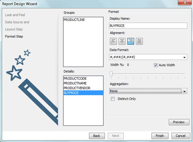 - Format the fields, insert masks, alignment, aggregation functions and then click on Finish: