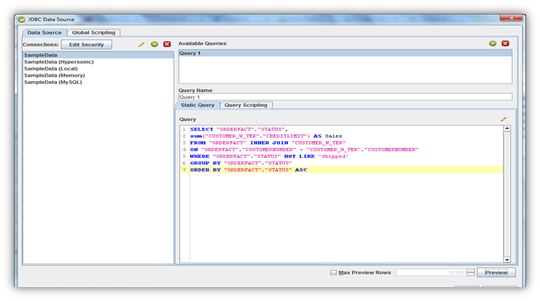 SELECT "ORDERFACT"."STATUS", sum("CUSTOMER_W_TER"."CREDITLIMIT") AS Sales