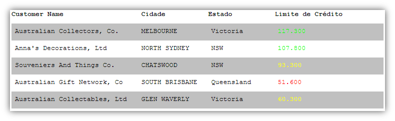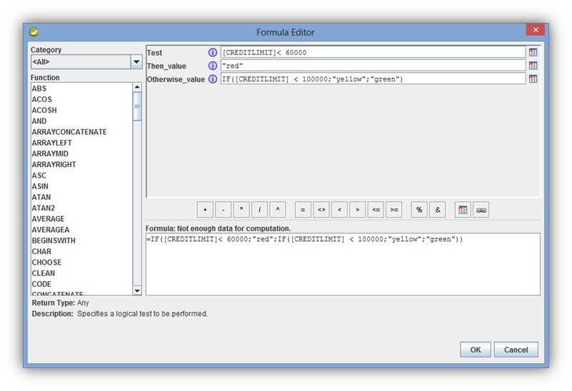 =IF([CREDITLIMIT]< 60000;"red";IF([CREDITLIMIT] < 100000;"yellow";"green"))