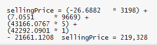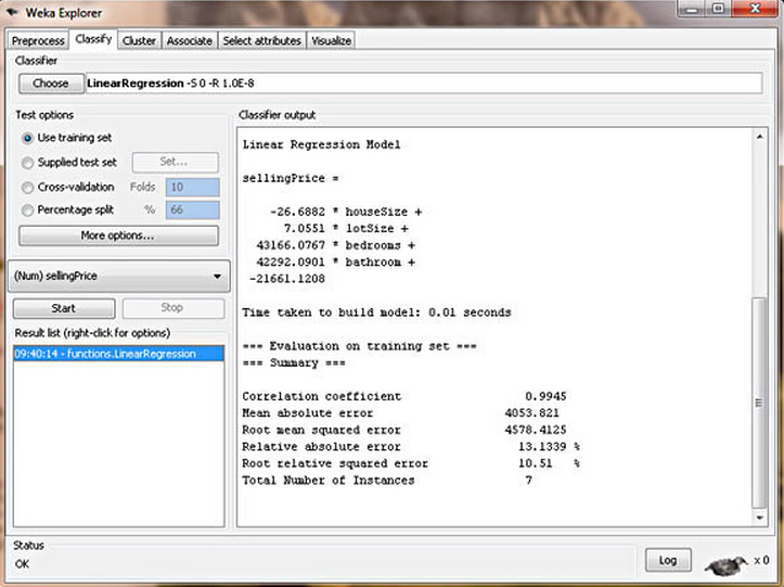 Bigger houses reduce its value – Is Weka pointing that the bigger the house is, the lesser is the selling price? This can be seen by the negative coefficient in front of houseSize variable. Is the model saying that for each foot of the house the price is reduced in $26? It does not make sense. How should we interpret it? This is a good example of trash. The house size, unfortunately, is not an independent variable because it is related to room’s variable, what makes sense since bigger houses have more bedrooms. Therefore, our model is not perfect. But we can fix it. Remember: At Preprocess tab is possible to remove colums from dataset. For your own practice, remove houseSize and create another model. How does it affect the value of the house? Does this model makes sense? (Now the value of my house is $271.894)