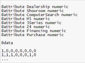Rows that begin with % are comments. Many datasets of learning machines at ARFF format are available at Weka directory in “\data” file.