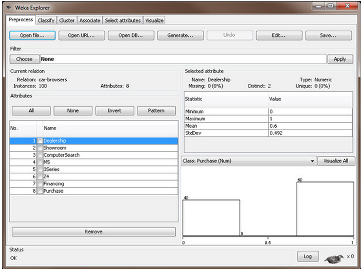 Load bmw-browsers.arff file at Weka using the same stages as we used to load data on Preprocess tab.