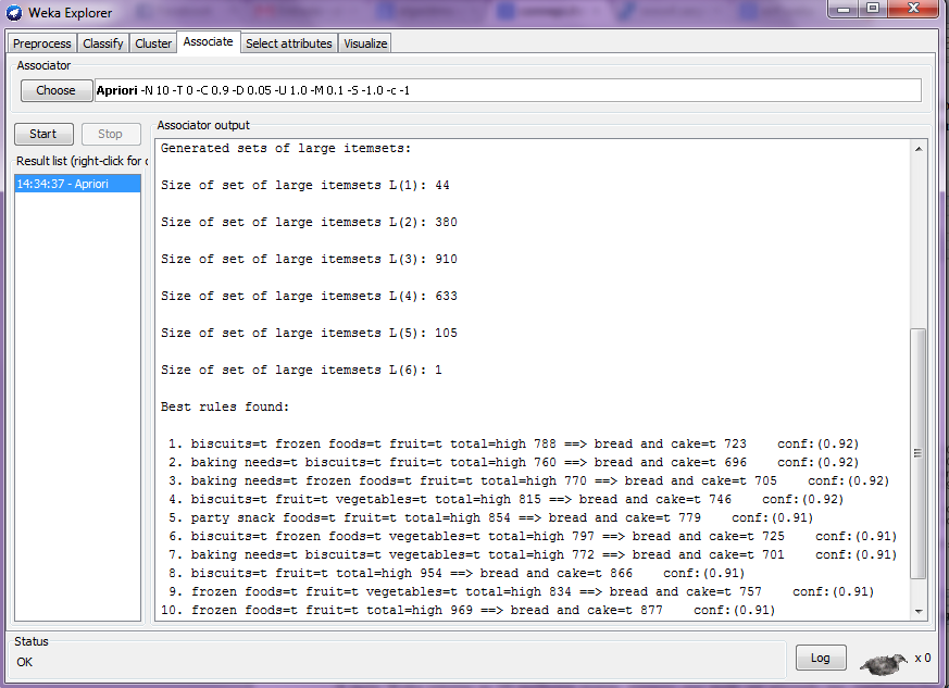 - If the client bought cookies, frozen foods, vegetables and the total was expensive, it means he bought bread and cake. 91% of confidence.
