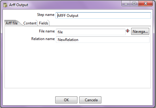 The mapping between the type of Kettle input field and the type of ARFF attributes that will be recorded on file is shown on Fields tab. Any problem here can be corrected through data modification. ARFF output stage maps Kettle String type to ARFF nominal, number and integer to numeric, and date to date. All the formatting and accuracy of data is respected. At this tab, you can also specify that each row on ARFF file must be specified using the Kettle input. If this option will not be selected, as default, each instance on ARFF file receives weight 1. Default ARFF format can support weights 3.5.8 and so on.