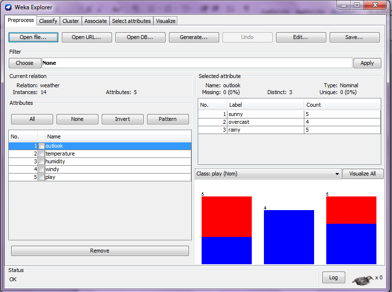 This screen presents information about the set of data: there are 14 instances and 5 attributes; the attributes are called outlook, temperature, humidity, windy and play. The first attribute, outlook, is selected as default and there are no lost values, it has three different values, nonexclusive and the real values are sunny, overcast and rainy, occurring five, four and five times respectively.