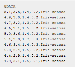 The data section of the ARFF file contains the data declaration and real instances Data declaration# Data declaration is an unique line that indicates the beginning of data segments in the file. The format is: @data.